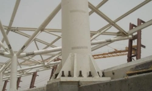 01. Most of the profiles used were tubular sections to achieve a visually appealing aesthetic, as the roof steel was exposed. The joints were critical, and large connection plates with odd shapes were required based on the connection requirements. The cantilever trusses had cambers and pre-sets, which resulted in challenges when setting out the geometry.